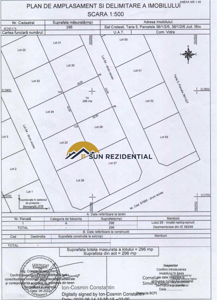 Teren intravilan de vanzare in Vidra - pe strada Lacramioarei, avand o suprafata de 296 mp si deschiderea de 16 ml la 1 strada.